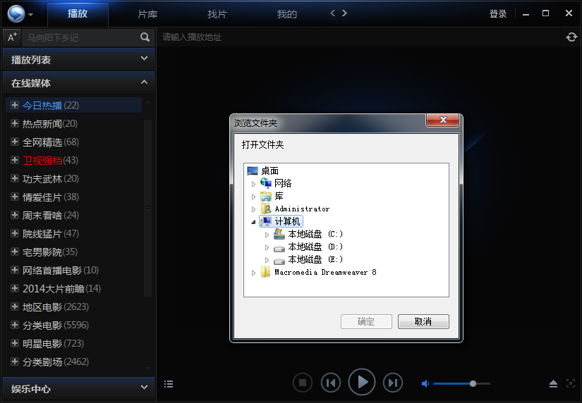 5、選擇打開文件夾,會彈出瀏覽文件夾,你可以打開本地保存的視頻文件