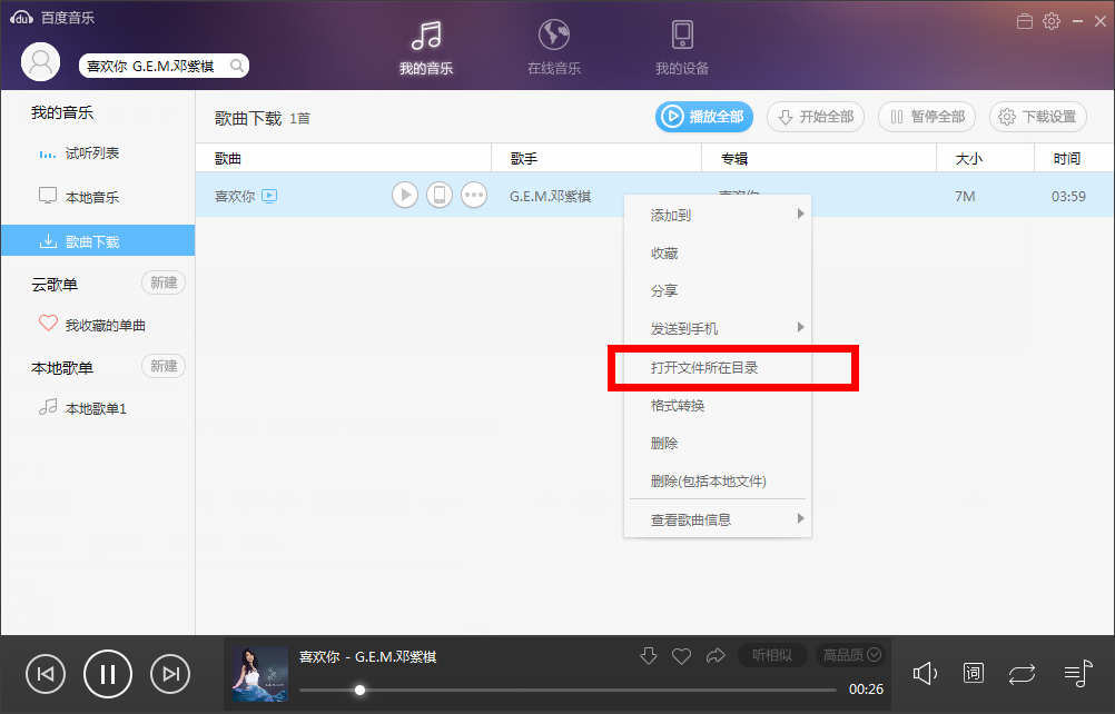 2、在下載的歌曲列表選中一首下載的歌曲,右鍵選擇打開文件所在目錄,就是百度音樂下載歌曲保存的文件夾位置。