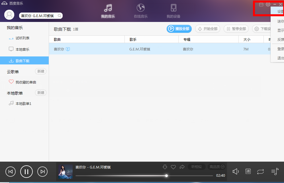 進入到百度音樂播放器之后,首先是找到我們想聽的歌曲;然后進行試聽,確認無誤之后,我們就可以將歌曲下載保存到本地。以便隨時可以試聽,還可以將下載的歌曲導入手機、平板、U盤等移動設備使用試聽。