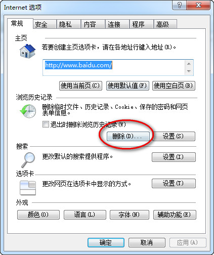 在 Internet 選項設置窗口中點擊“刪除”按鈕