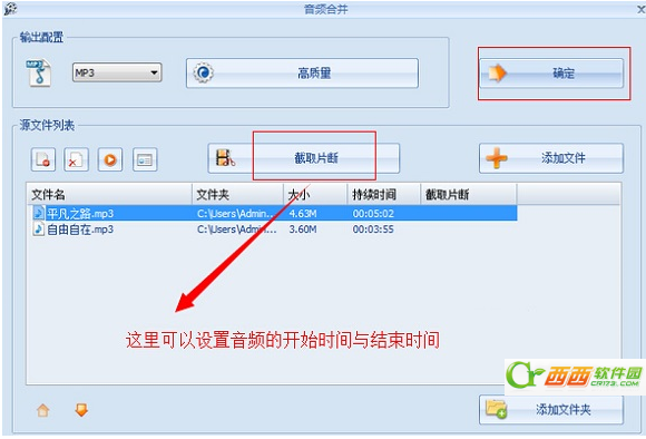 添加完成后,用戶還可以點擊【截取片段】來設置合并后的歌曲開頭與結尾時間,方便控制歌曲長度或者保留自己所喜歡的部分,這個大家根據自己喜歡設置,也可以不設置。