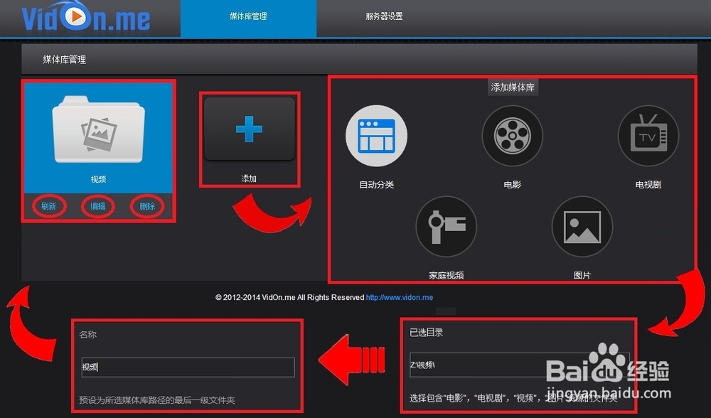 (1)在PC端安裝威動服務器(VidOn Server),在服務器的圖標(電腦右下角)單擊右鍵并且選擇“服務器管理”,在瀏覽器中彈出威動服務器頁面,點擊“+”,選擇要添加的媒體庫類型,推薦選擇“自動”。