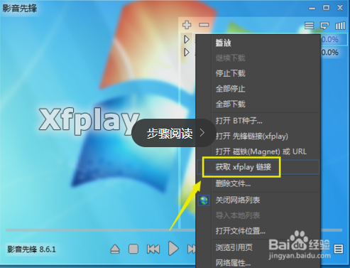 從打開的播放列表中右擊要下載的視頻文件,從彈出的擴展面板中選擇”獲取xfplay磁鏈“項。
