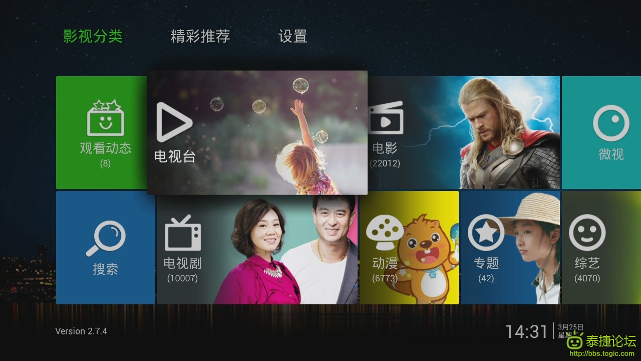 5.打開泰捷視頻,就可以看到600+直播電視、上萬點播電影、電視劇、動漫及綜藝節(jié)目,還可以用自定義添加軟件沒有的境外頻道哦!自定義使用詳解:http://bbs.togic.com/thread-4091-1-1.html