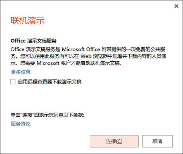 最左側的放映欄大家應該再熟悉不過了,從頭開始依舊是經典的“F5”,沒有太多出奇。但是不得不提一下聯機演示這個功能。這對異地或者多地PPT演示有極大的幫助,接受協議就會彈出一個URL,將URL分享給任何能聯網的設備,通過瀏覽器就可以實現在一臺PC上放映,多臺設備同時觀看的功能,非常實用!