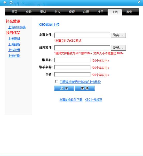 3) 在彈出的窗口中正確添加歌詞文件(*.KSC)和歌曲伴奏文件(*.wma *.mp3 ),正確填寫相關信息后,點擊“上傳”,按鈕,然后按照屏幕提示向導完成上傳操作。