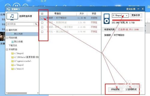 6、彈出復制到移動設備的對話框,您只要對其需要下載的歌曲前面打鉤,在勾選好的歌曲下方點擊“開始復制”即可復制,如果您需要下載歌詞別忘了在“復制歌詞”前打勾哦