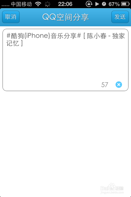 4、之后點擊空白處,就會彈出分享層,點擊分享按鈕,會彈出菜單,讓你選擇分享到哪里,目前舊版的酷狗音樂支持分享到 QQ QQ空間 微信 新浪微博 和朋友圈,但新版的好像屏蔽了分享的朋友圈的權限