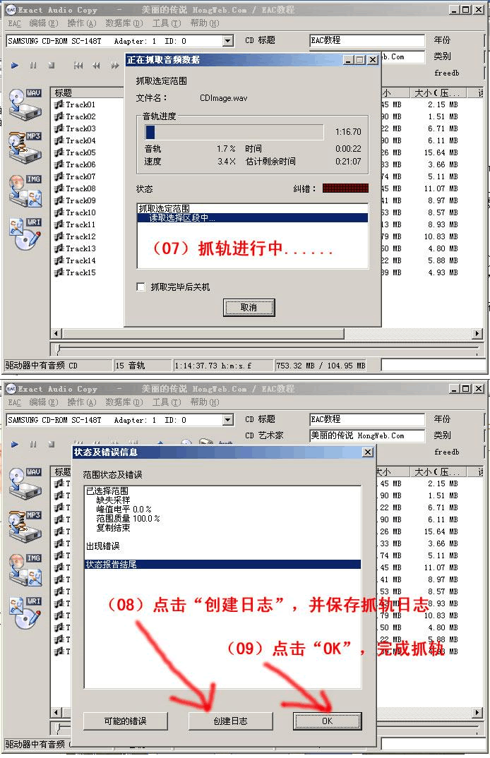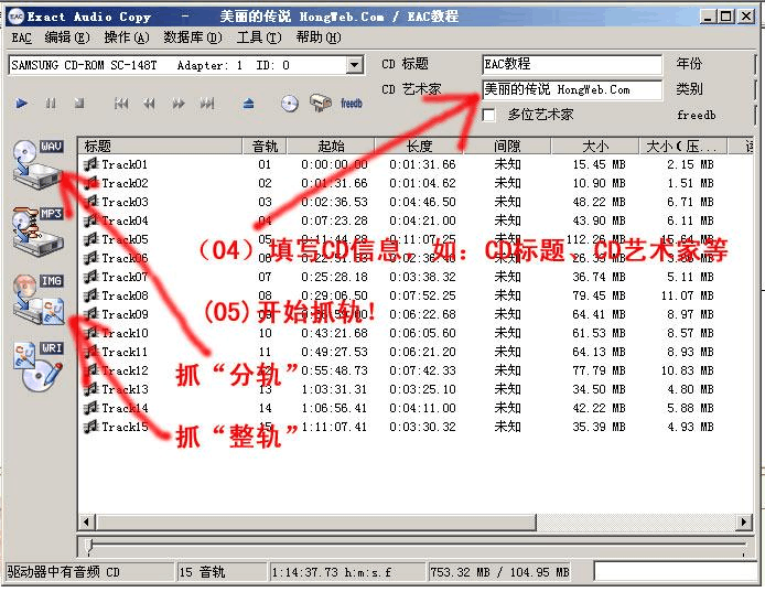 注解:整軌方式要比分軌方式好,抓成整軌,隨時可以利用CUE列表,生成分軌歌曲文件,同時在刻錄CD的時候,整軌方式保留的原CD光盤歌曲之間的間隙(原滋原味);所以建議大家抓軌的時候抓成整軌。