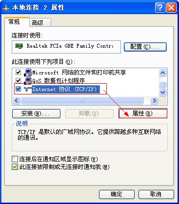 3、選擇“Internet協議(TCP/IP)”,單擊“屬性”打開。(或者雙擊該協議名稱)