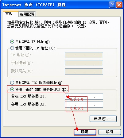 4、勾選“使用下面的DNS服務器地址”,首選設置為8.8.8.8,備選設置為6.6.6.6。IP設置不動,保持原有狀態即可。