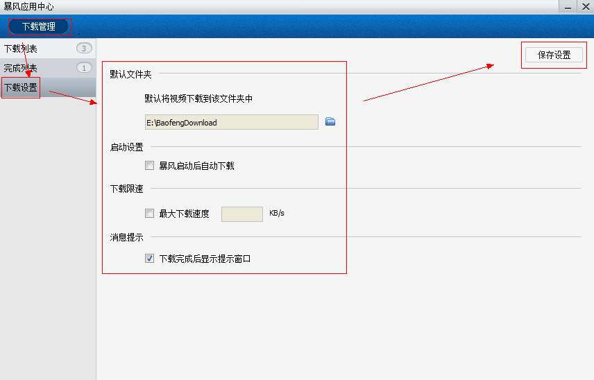 點擊“確定”。暴風默認的下載路徑是暴風安裝時自建的文件夾“BaofengDownload”文件夾。自己可以根據(jù)自己的需要更改路徑。