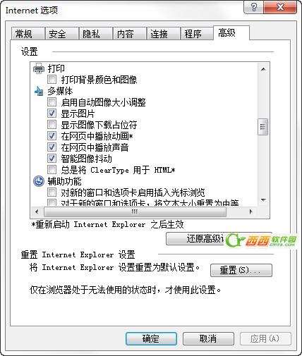 4、點擊工具-internet選項-點擊高級頁-在多媒體欄里構選(顯示圖片)和(在網頁中播放動畫、視頻)。