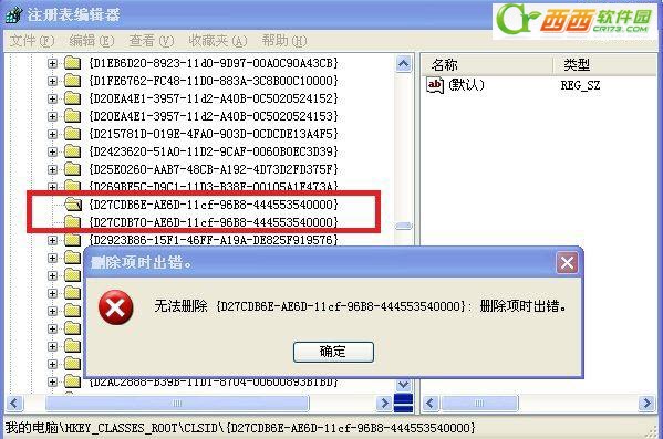 3、打開注冊表(打開方法:開始菜單-運行-輸入regedit-確定),依次找到[HKEY_LOCAL_MACHINE/SOFTWARE/Microsoft/Internet Explorer/ActiveX Compatibility],將其下面的{D27CDB6E-AE6D-11CF-96B8-444553540000}項或{D3f97240-C9f4-11CF-BFCr-00A0C90-00A0C90C2BDB}項刪除(如圖三),重啟IE。