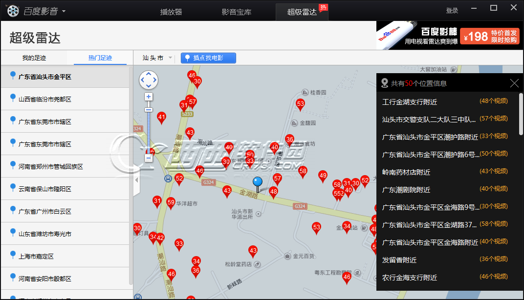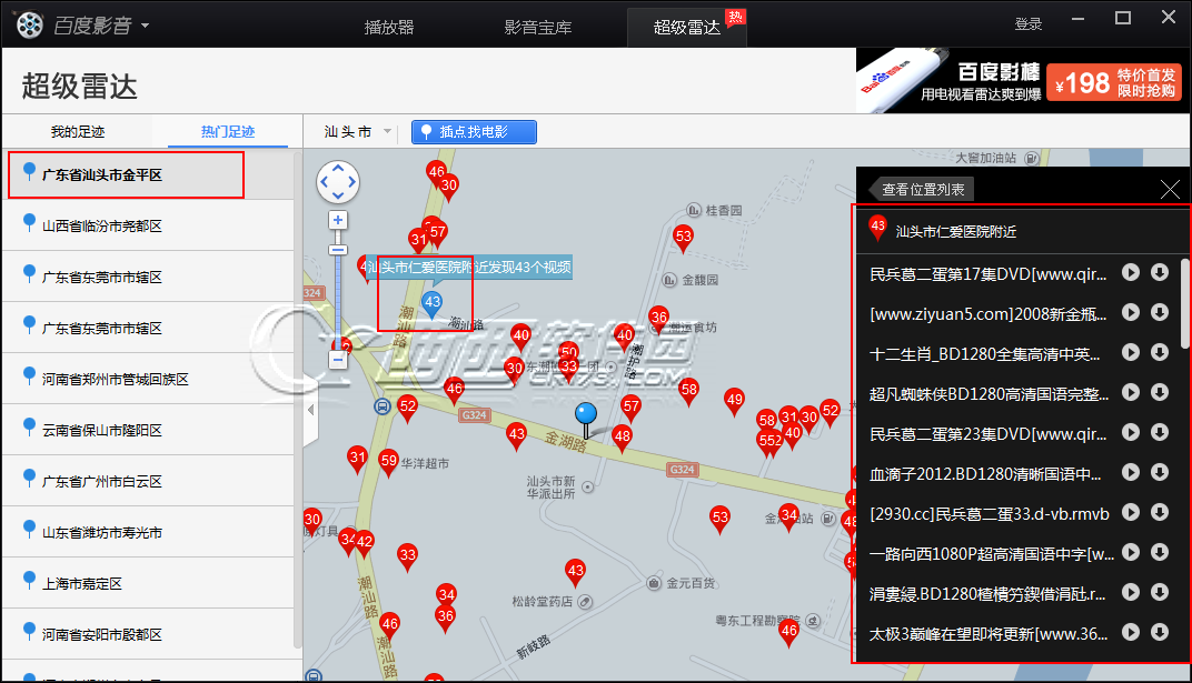 4、熱門足跡中記錄的是使用超級雷達這個功能最多的用戶地區,并記錄了該地區用戶正在觀看的視頻。我們可以通過選擇左邊的地區名來選擇查看當前地區的用戶正在觀看的視頻。