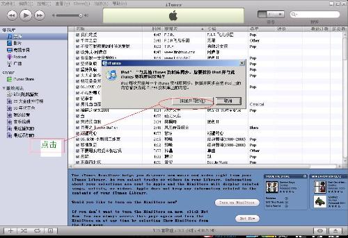 第六步:安裝結束后電腦會自動進入itunes操作界面,連接ipod。注意:初次使用itunes會要求抹除ipod內的所有歌曲文件,如果點擊“否”或關閉對話框,itunes將不可用,所以必須抹除并同步方可。 itunes會自動搜索電腦內所有歌曲文件并找到ipod在左側顯示ipod圖標。