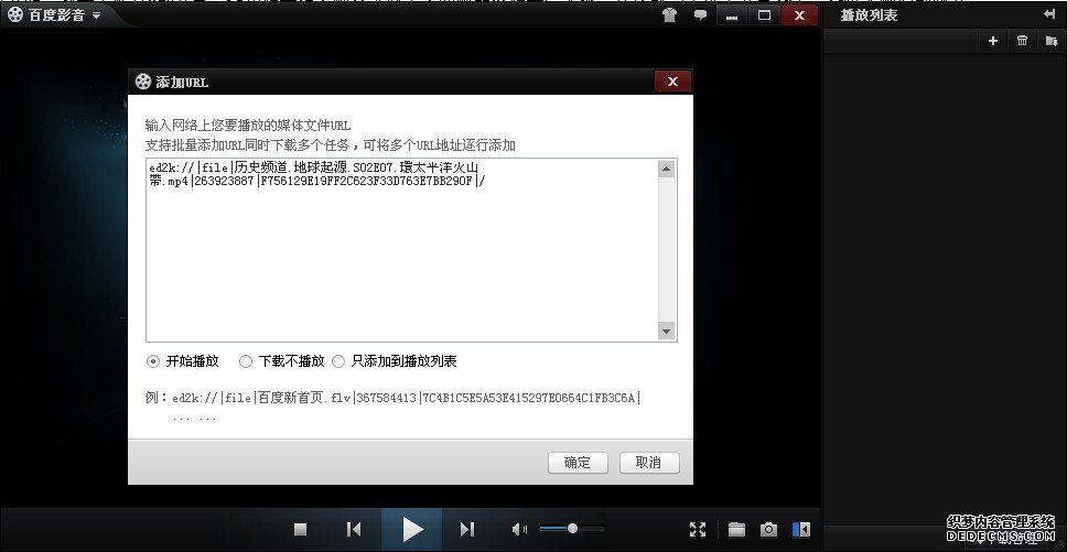 點擊添加URL后會彈出一個輸入ED2K鏈接的對話框,此時你把剛才在BT盒子種子搜索神器復(fù)制的播放地址粘貼進(jìn)去,點擊確定,如圖4: