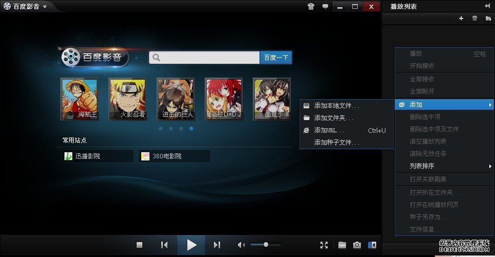 復(fù)制好播放地址后,就打開你的百度影音,在百度影音的播放列表中右鍵,選擇添加-添加URL,如圖3: