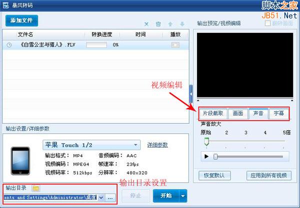 格式選擇完成之后,回到軟件主界面,在軟件的右邊具有視頻編輯功能,其中包括,視頻截取、畫面裁切、聲音縮放及添加字幕等幾項(xiàng)功能。不需要的朋友,可直接設(shè)置文件的輸出目錄。