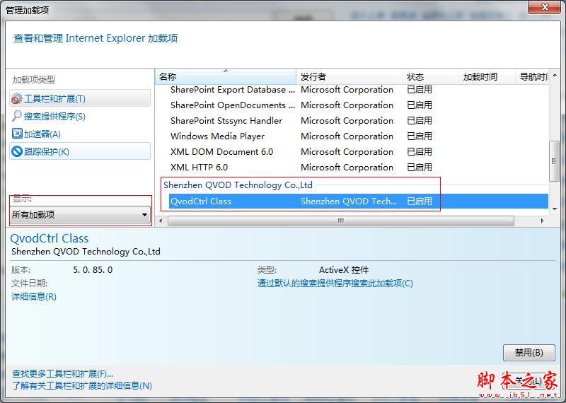2.由于您的瀏覽器管理加載項中禁用了快播插件引起。解決辦法:打開IE瀏覽器,在菜單欄工具項→找到加載項管理器→“啟用”或“禁用”加載項,并在彈出的對話框中啟用所有以ShenZhen QVOD 開頭的加載項,