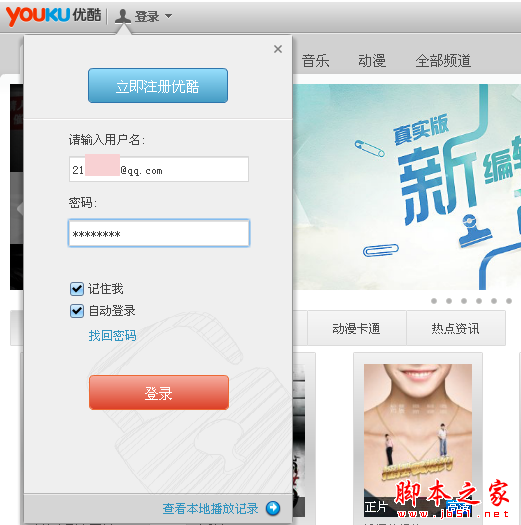4、再回到優酷客戶端,輸入剛才注冊的用戶名郵箱及密碼,登陸。(如果電腦不是自己的,就請不要保存記住和自動登陸)