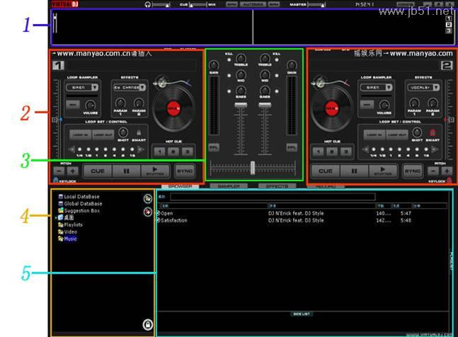 這就是VDJ的混音臺界面窗口,不要被眾多的按鈕和旋鈕嚇住,其實它的布局是很合理的,下面我們就來