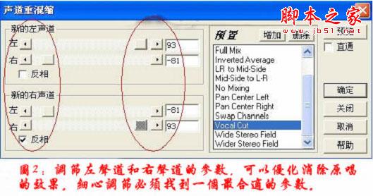 此對話框在默認設置下已處于以最大程度消除原音的狀態,因此要想把原音消除的更干凈,基本上在這里是沒有任何辦法的。我個人發現,不同人唱的歌曲,消原唱的效果并不一樣。有些會比較好些,有些就很不理想。但是我們可以通過“聲道重混縮”對話框左面的四個滑塊對這項處理進行優化見(圖2)。由于最終效果受原聲帶的影響非常大,所以這里的調整沒有固定的“定式”,只能將滑塊略微移動到中心點時,立體聲效果會比較明顯,但是人聲也會變得比較明顯。在立體聲和人聲消除效果上,總得向一方妥協。這里先把處理后的結果保存為“命中注定(伴奏).MP3”。