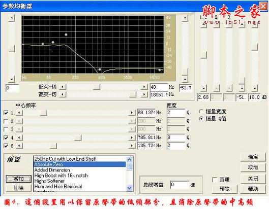 現在先調入“命中注定.MP3”原聲帶,選擇“Effects”→“Filters” →“parametric Epualizer”(中文為“效果”→“濾波器”→“參數均衡器”),進入“參數均衡器”后,將參數調節成圖4的樣子。點“OK”后立即進行處理,這樣就能得到“命中注定”原聲帶里的低頻部分,這里暫時先保存個文件為“命中注定(BASS).MP3”。(再次提醒大家,保存最好從一開始就用無損的WAV格式來保存,這樣最后出來的效果會好一些。)