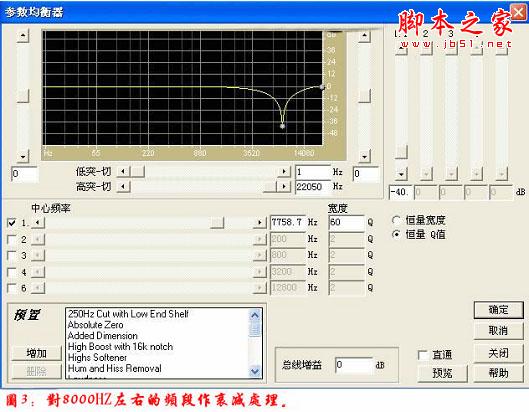 消除“咝咝啦啦”聲一般要使用Cool Edit Pro的“均衡器”功能。首先調入剛剛消除好后的伴奏“命中注定(伴奏).MP3”,選擇“Effects”→“Filters” →“parametric Epualizer”(中文為“效果”→“濾波器”→“參數均衡器”)。此“參數均衡器”對于初學著來說不是很直觀,這里不是很懂均衡器的朋友也可以選擇用“圖形均衡器”來調節,它的*作界面要比“參數均衡器”直觀容易得多。這里我以“參數均衡器”來消除伴奏中的“咝咝啦啦”聲。“均衡器”的作用是增強或衰減某一頻率段或某幾個頻率段的聲音強度。“咝咝啦啦”聲通常處于8000Hz左右,我們將這一區域的聲音強度作衰減處理 見(圖3)。