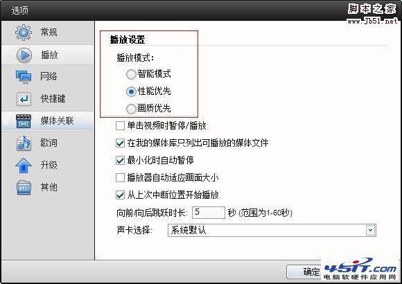 或者在快播播放器設(shè)置-播放-“播放模式”調(diào)到“性能優(yōu)先”模式或“畫質(zhì)優(yōu)先”模式后看看。如圖: