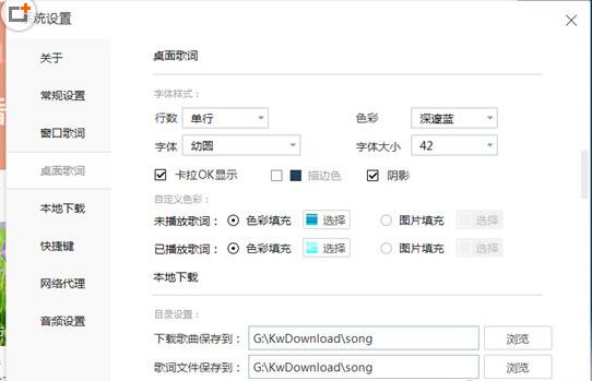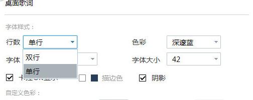 4、用戶可以在這里設置歌詞的行數,能夠設置單行或者雙行,還可以設置桌面歌詞的字體和字體大小,顏色和陰影等設置都任你選擇,根據用戶自己的喜好進行調整,如下圖所示: