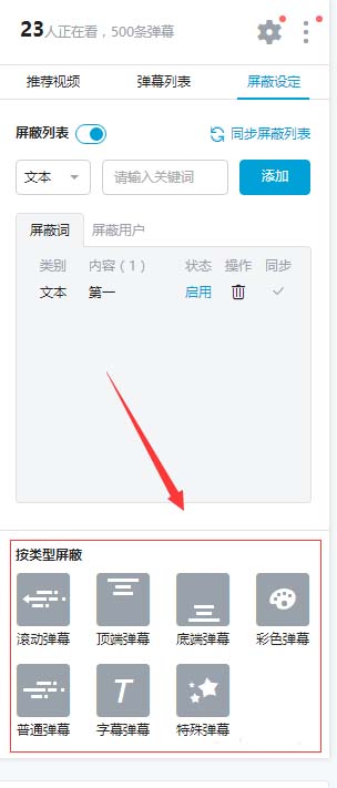 5、在屏蔽設(shè)定的底端我們可以看到有個按彈幕類型屏蔽的設(shè)定,例如對于一些遮擋字母的彈幕也可以屏蔽掉