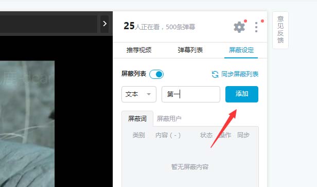 3、如圖所示我們在文本輸入框中輸入想要屏蔽的彈幕關(guān)鍵字,然后點擊確定添加即可