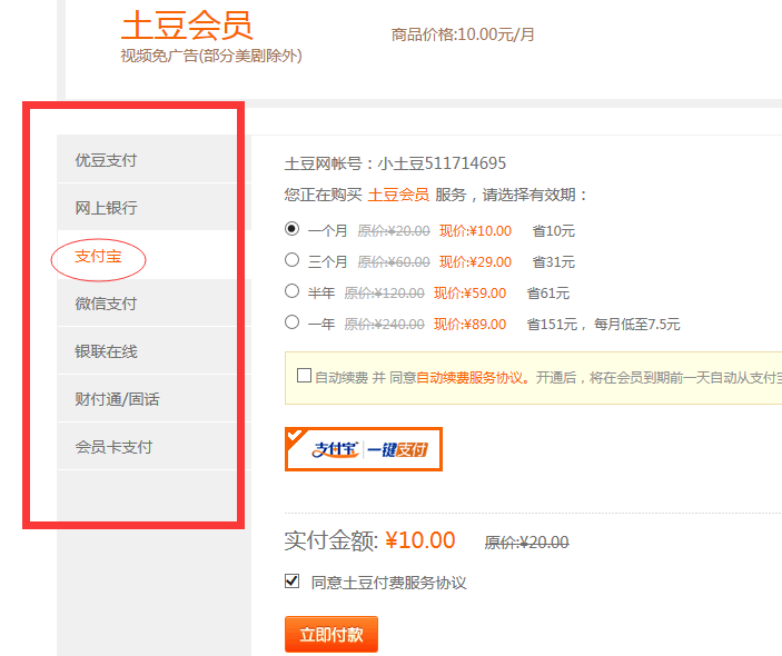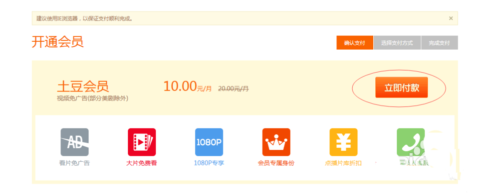 3、進入會員開通頁面(目前土豆在搞活動,開通會員可以打折哦),點擊立即付款