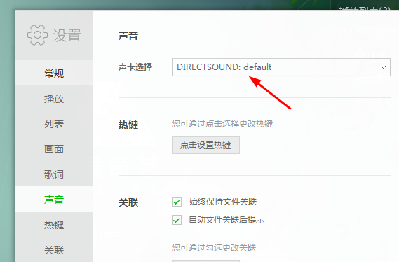 4、在設置的界面點擊聲音,可以看到聲卡選擇,這里的選擇默認的DIRECTSOUND;default,如圖所示