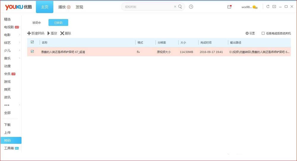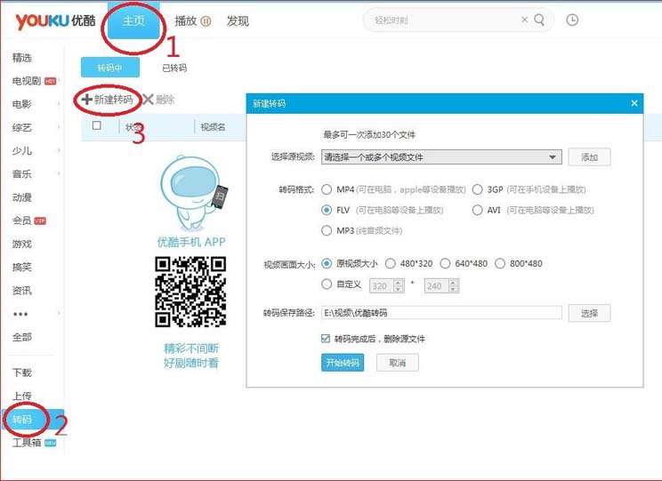 3、接下來在優(yōu)酷客戶端中點(diǎn)擊主頁,然后點(diǎn)擊轉(zhuǎn)碼,然后點(diǎn)擊上方的新建轉(zhuǎn)碼(見圖)。