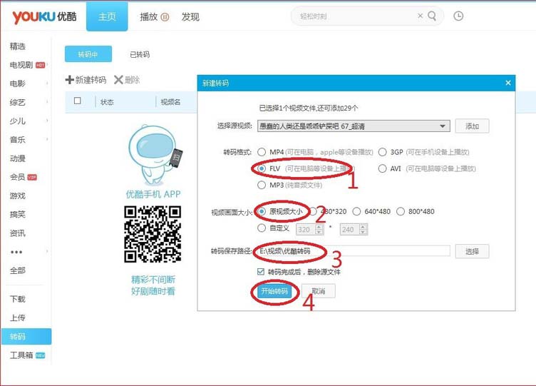5、接下來設(shè)置轉(zhuǎn)碼參數(shù),格式選擇flv(mp4也可以),畫面大小選擇原視頻大小,設(shè)置保存途徑,最后點(diǎn)擊開始轉(zhuǎn)碼(見圖)。