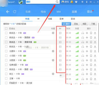 2.搜索想唱的歌曲,注意要有MTV圖標的才有MTV視頻