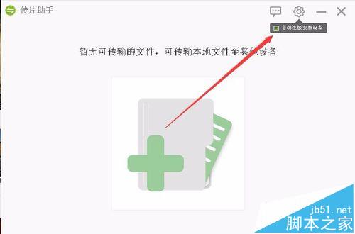 8、這時會打開傳片助手窗口,點擊右上角的設(shè)置按鈕,在彈出菜單中去掉“自動連接安卓設(shè)備”前的勾選