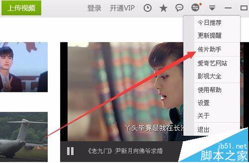 7、接下來我們再次點擊客戶端右上角的選項按鈕,在彈出菜單中選擇“傳片助手”菜單項