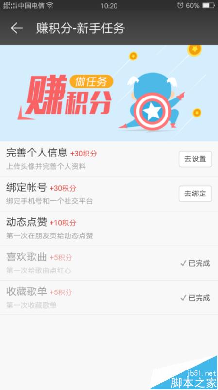 2、完成新手任務賺積分。完善個人信息得30積分,綁定賬號得30積分,在朋友頁給動態點贊得10積分,第一次給歌曲點紅心得5積分,第一次收藏歌單得5積分。