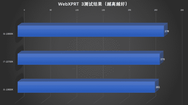 運(yùn)行WebXPRT3測(cè)試,i9-10900K成績(jī)?yōu)?78;i7-10700K成績(jī)?yōu)?70;i5-10600K成績(jī)?yōu)?61。