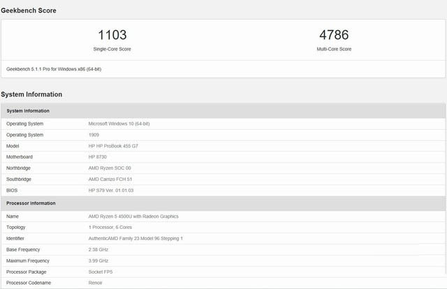此外,在Geekbench 5測試標準中,AMD Ryzen 5 4500U處理器單核得分1103分,多核得分4786分。