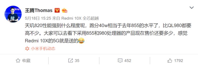 小米高管表示,聯發科天璣820處理器的跑分高達40W,已經和去年驍龍855處理器的跑分差不多,比麒麟980處理器要高一些;麒麟980處理器和驍龍855處理器都是旗艦產品,因此搭載這兩款處理器的智能手機價格都相對較高一些,而Redmi 10X的價格會遠低于搭載這兩款處理器的智能手機。