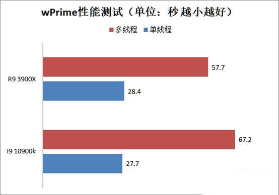 wPrime測試中, i9-10900K單線程成績為27.7秒,這也是wPrime 32M單線程測試的最好成績(默頻)。多線程成績為67.2秒,落后銳龍大約17%左右。