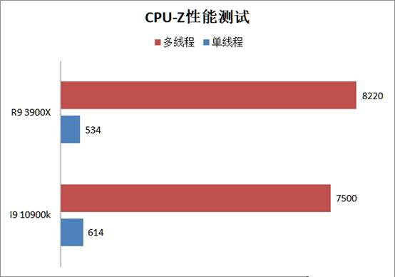 cpu-z測試中,i9-10900K處理器的單線程分數為614,是目前為止CPU-Z的最高單核成績(默頻)。多核方面,性能落后于3900x大概10%左右,這也是意料之中的,畢竟3900x的核心線程數量要比10900k多。