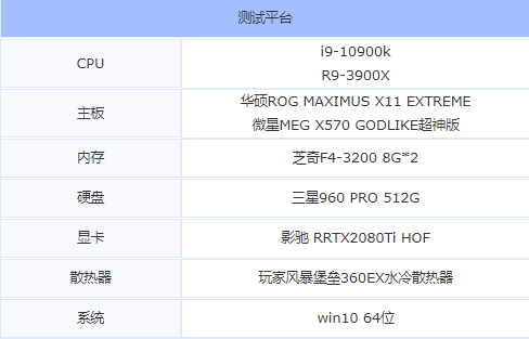 測試平臺中,i9 10900k用的是華碩ROG MAXIMUS X11 EXTREME主板,R9 3900X用的是微星MEG X570 GODLIKE超神版主板,其它配件如上表所示。
