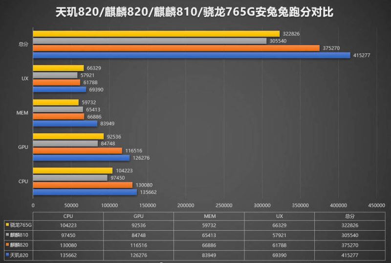 聯發科官方表示,官方稱其單核得分相比高通 765G 提升 7%,多核提升37%。關于這一說法, 我們從跑分數據中得到印證。天璣 820 Geekbench 5 單核跑分 647 分,多核跑分 2606 分。至于安兔兔跑分,則超過了 40 萬分,與驍龍 768G 的性能相當。