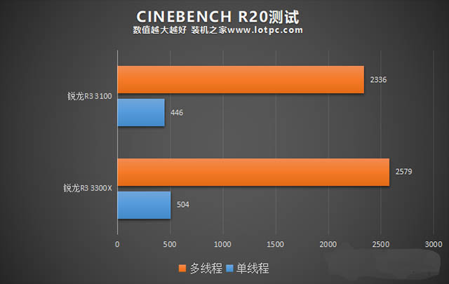 CINEBENCH R20測試中,AMD銳龍R3 3300X相比R3 3100在單線程領先了13%,而在多線程方面領先了10%,與CPU基準測試結果差距不大。
