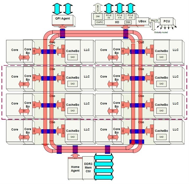 自己有工廠生產(chǎn)CPU芯片的英特爾,在片內(nèi)總線的選擇上,更偏向?qū)π实淖非蟆K葬槍?duì)不同的應(yīng)用場(chǎng)景使用了不同的結(jié)構(gòu)。比如在MSDT平臺(tái)上,因?yàn)楹诵臄?shù)量相對(duì)少,大多數(shù)家用級(jí)用戶(hù)很少需要去應(yīng)對(duì)大規(guī)模并發(fā)數(shù)據(jù)運(yùn)算的情況,因此選擇了延遲控制更好的環(huán)形總線(RingBus)。